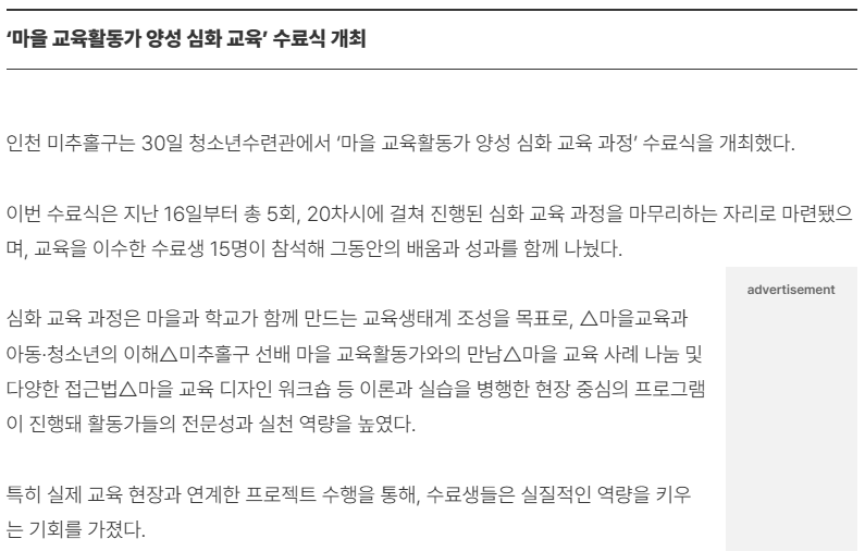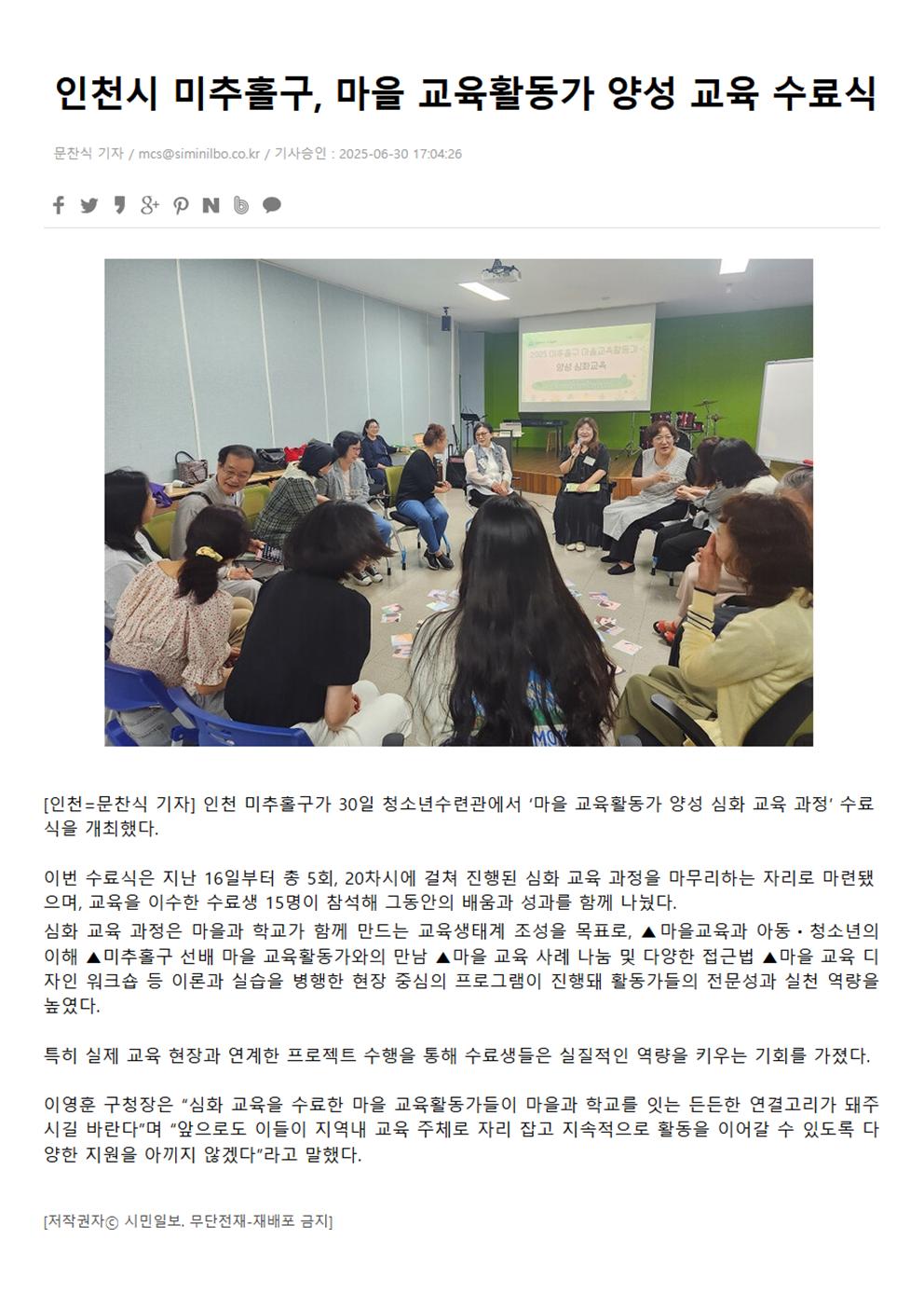 [시민일보] 인천시 미추홀구, 마을 교육활동가 양성 교육 수료식