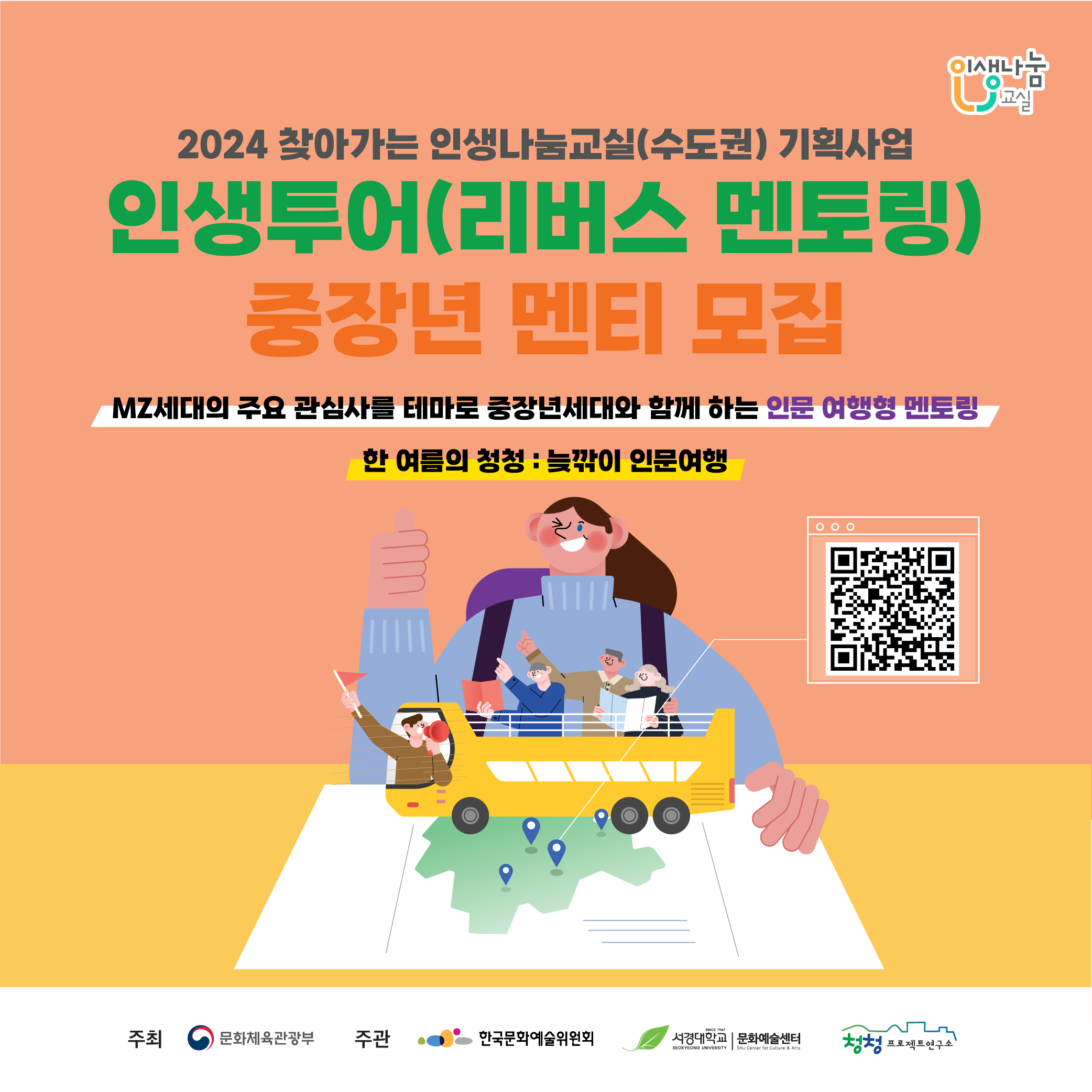 09월 11일(수) ~ 09.26(목) 까지 「2024 인생나눔교실(수도권)」 기획사업 '인생투어(리버스 멘토링)' 중장년 멘티를 모집합니다!