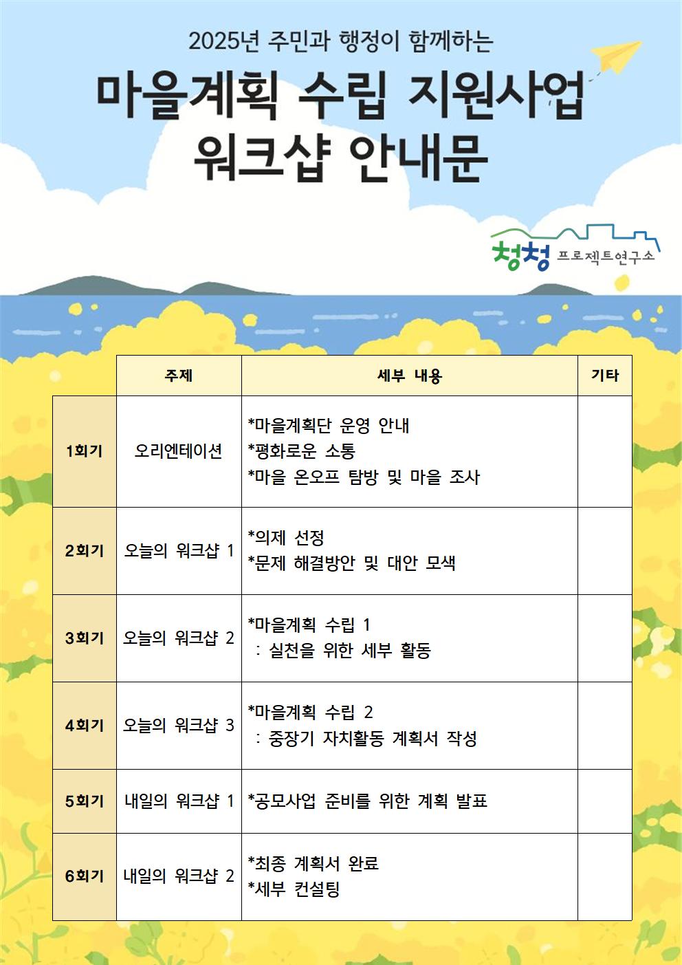 마을계획 수립을 위한 사전 조사 및 기획, 주민참여 워크숍 등 각 6회기 워크샵으로 진행될 예정입니다.